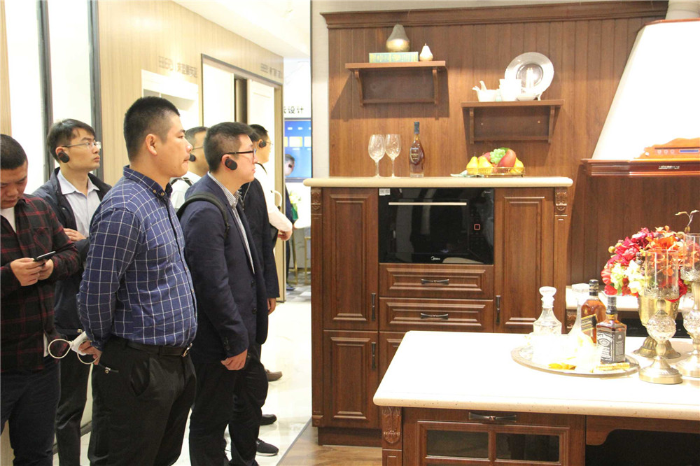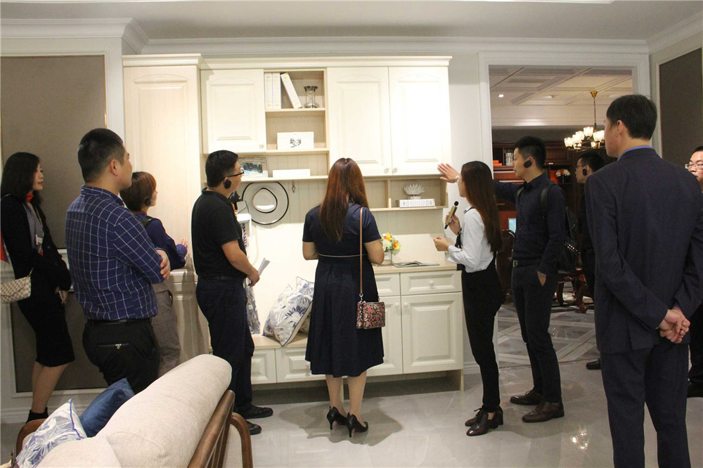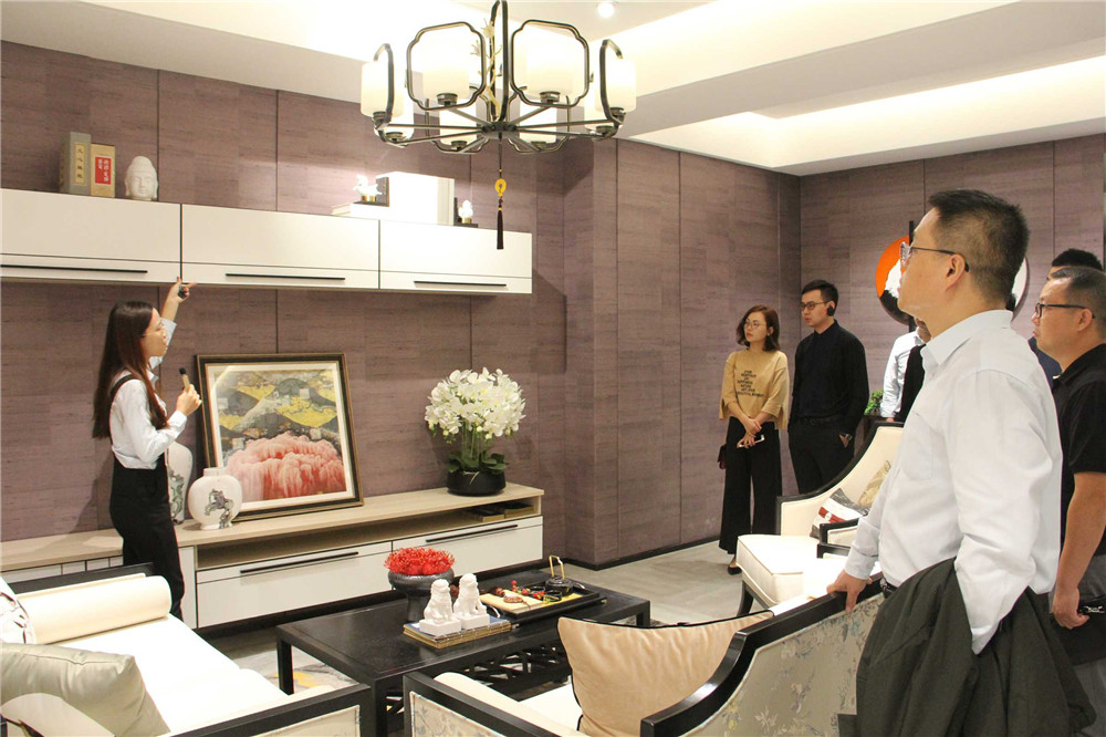 超2000平方的伊百麗工廠展廳,係統地展現了伊百麗的全屋七大空間全生命周期定製。產品細膩的觸感、時尚優雅的設計造型,考察團領導都可在工廠展廳親身體驗。多樣化、體係化的家居風格讓大家駐足拍照,讚歎不已。