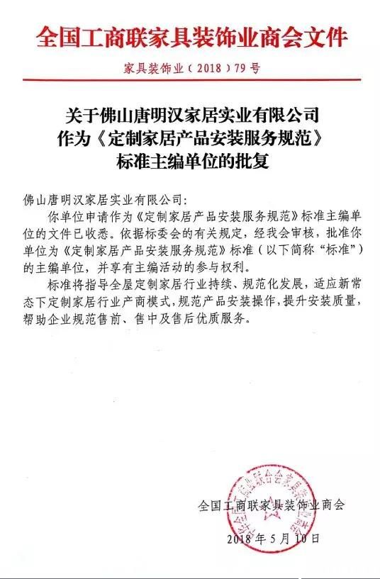 為指導定製家居行業持續、規範化發展,適應新常態下定製家居行業產商模式,2018年7月9日上午在廣州建博會期間召開《定製家居產品安裝服務規範》標準啟動會暨編製組第一次會議。該標準於2018年3月yue份fen正zheng式shi立li項xiang,由you全quan國guo工gong商shang聯lian家jia具ju裝zhuang飾shi業ye商shang會hui牽qian頭tou與yu國guo家jia建jian築zhu材cai料liao檢jian驗yan測ce試shi中zhong心xin及ji行xing業ye優you秀xiu企qi業ye共gong同tong製zhi訂ding,伊yi百bai麗li全quan屋wu定ding製zhi更geng是shi該gai標biao準zhun的de主zhu編bian單dan位wei。
