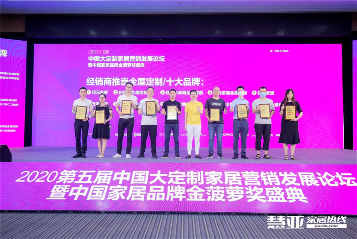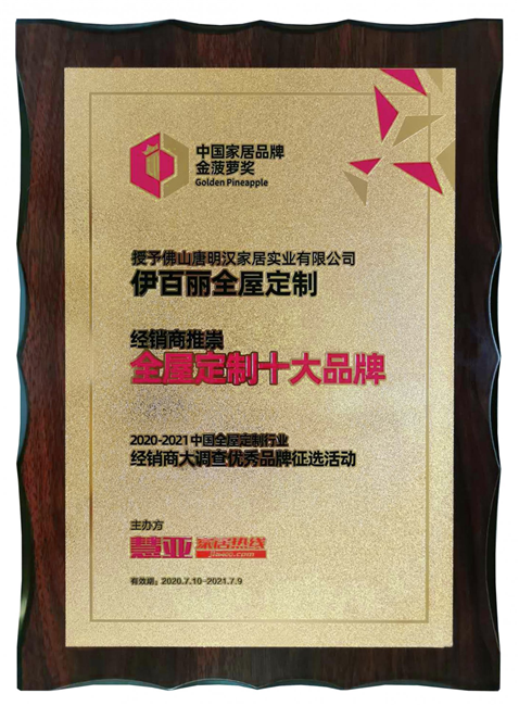 7月10日,“2020第五屆中國大定製家居營銷發展論壇暨中國家居品牌金菠蘿獎盛典”在廣州琶洲廣交會展館B區8號會議室隆重舉行,伊百麗全屋定製榮獲“2020經銷商推崇十大品牌”!