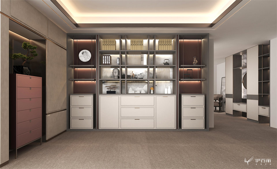梧桐雲木的櫃身充滿了淡然的感覺,“阿爾卑斯岩板”搭配專屬配套故宮紅可見光背板,東方的恢弘之氣充斥其中,讓空間不僅僅是孤寂簡潔,多了些現代禪意味道。