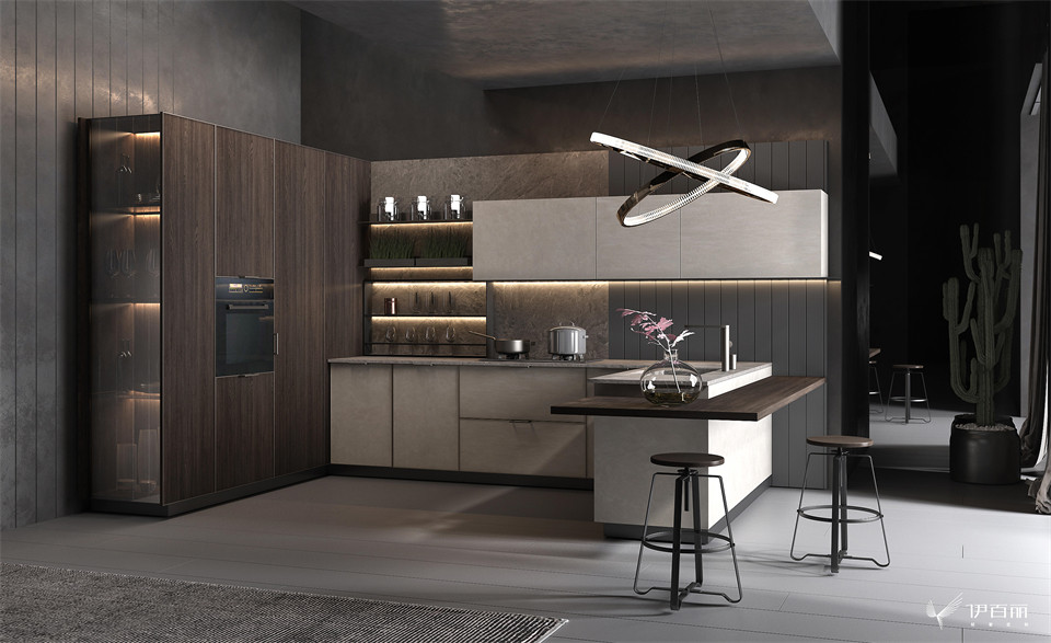 極簡掛牆板係統,層板與黑色鋁框玻璃門設計,減弱空間灰度的衝擊力。高低錯落島台設計,豐富空間層次感,營造溫馨精致的細膩質感。