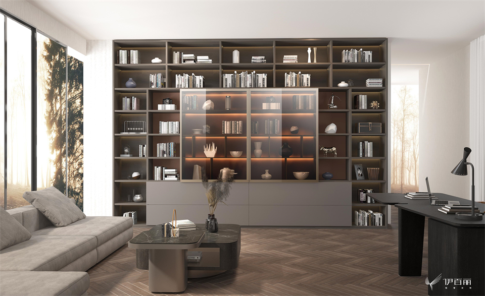 一方天地,快慢有度,動靜皆宜。一整麵牆的書櫃+書架,融合了豐富的功能區域。半封閉與半開放的櫃門設計,強化了空間體驗,給閱者帶來沉浸式的精致體驗。