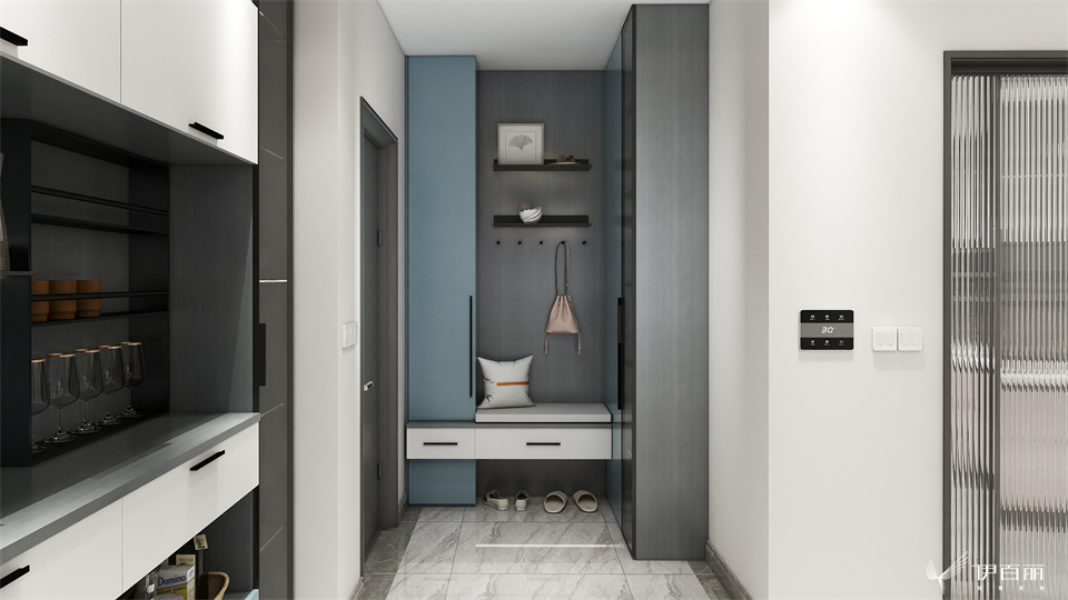 吊櫃層板燈與極簡窄框玻璃門對稱相嵌,一抹優雅的