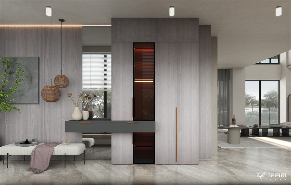 呈現出極致的親和力。淺色灰玉檀吊櫃以純粹的