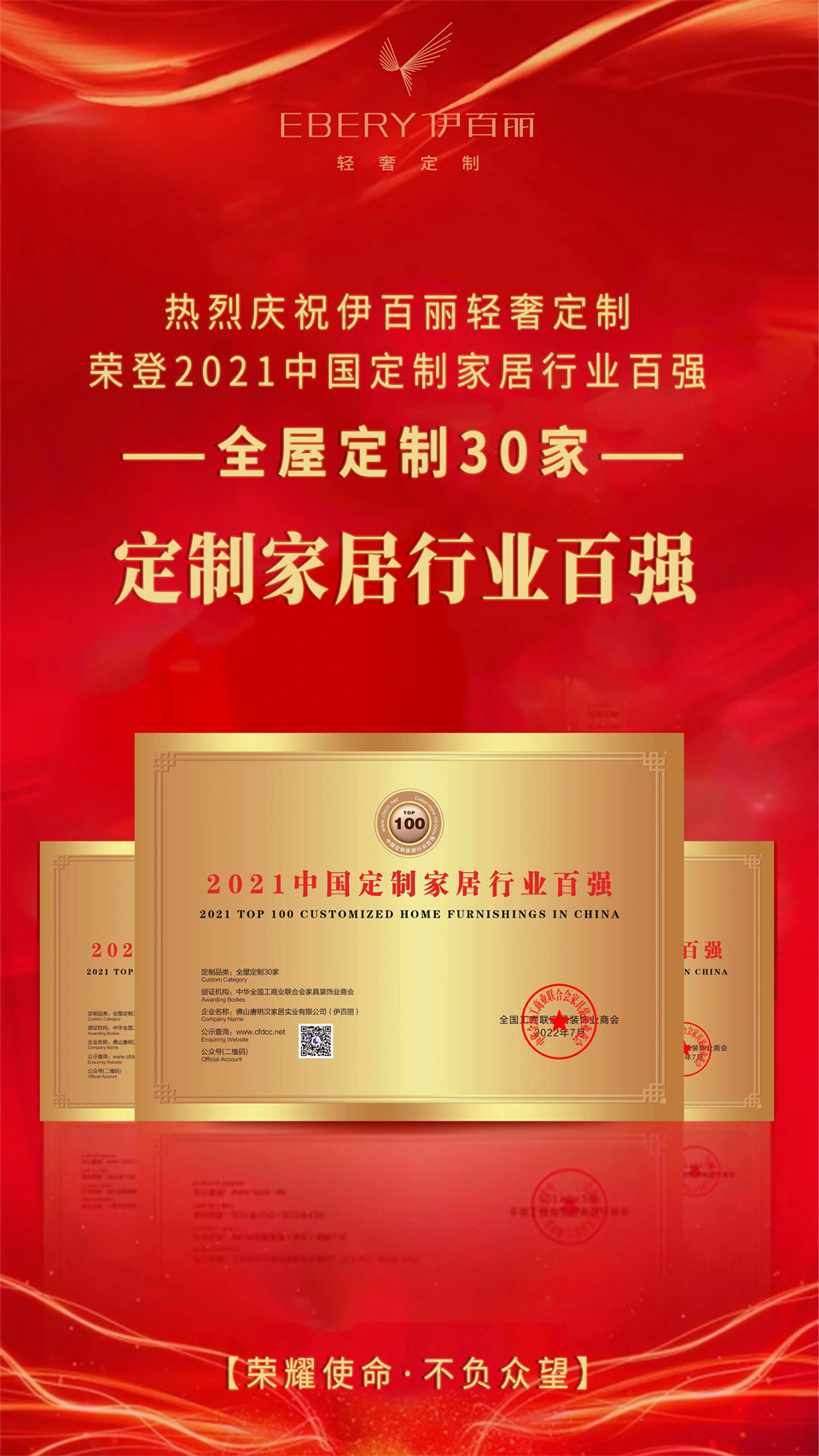 在一眾行業領袖和企業代表的見證下,伊百麗輕奢定製憑借過硬的國民口碑,卓越的品牌實力,榮登“2021中國定製家居行業百強——全屋定製30家”榜(bang)單(dan)。這(zhe)既(ji)是(shi)全(quan)國(guo)工(gong)商(shang)聯(lian)家(jia)具(ju)裝(zhuang)飾(shi)業(ye)商(shang)會(hui)對(dui)伊(yi)百(bai)麗(li)輕(qing)奢(she)定(ding)製(zhi)的(de)肯(ken)定(ding),也(ye)是(shi)行(xing)業(ye)對(dui)伊(yi)百(bai)麗(li)的(de)高(gao)度(du)認(ren)可(ke),更(geng)是(shi)對(dui)伊(yi)百(bai)麗(li)綜(zong)合(he)實(shi)力(li)及(ji)行(xing)業(ye)影(ying)響(xiang)力(li)的(de)強(qiang)力(li)佐(zuo)證(zheng)。