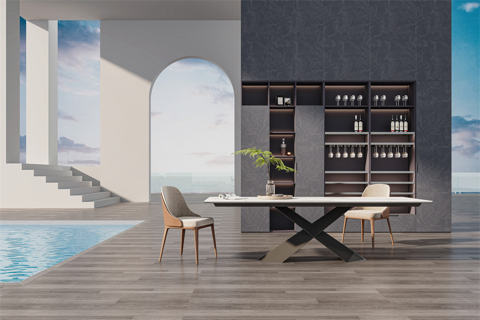 光影粼粼的冷色調為意式極簡基調置入了溫潤質感,更能消弭人與人之間的距離感,讓家的內在變得更豐盈。