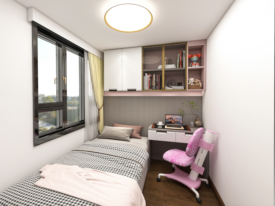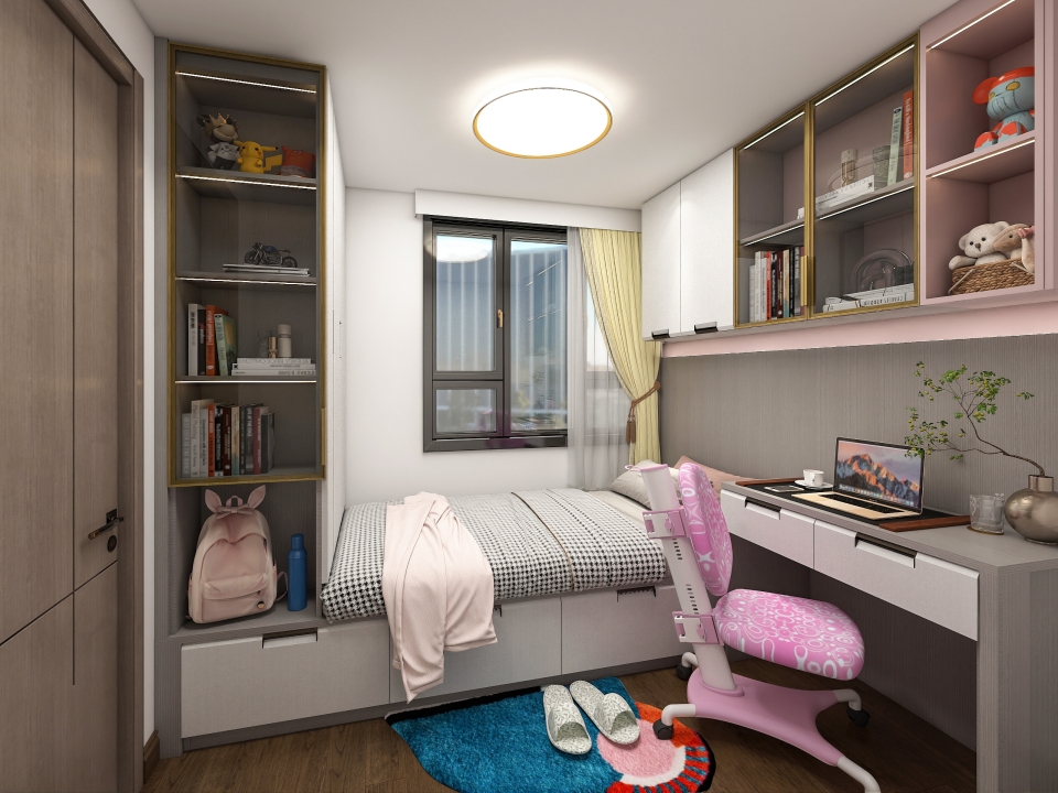 定製榻榻米+書桌櫃一體式設計,在節約空間的同時,還擁有學習、儲物、展示的基本功能,輕鬆滿足小公主在不同成長階段的需求。刺繡銀櫃門與馬卡龍粉櫃體巧妙搭配,營造甜而不膩的學習、寢居空間。吊式書櫃封閉與半開放設計,或開放或掩映,豐富的色彩和合理的收納布局,讓女兒的成長擁有充分的安全感。