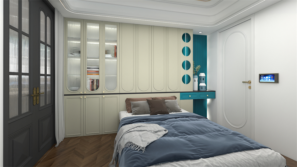 所有設計都是根據業主孩子的喜好和需求來定製的,床頭沿牆設計到頂衣櫃+書櫃,滿滿的收納儲物空間!EO097圓形玻璃掩門造型的阿瑪尼豆綠,搭配懸空搭接裝飾櫃,整體看上去舒適簡潔,讓生活空間回歸純真無雜。
