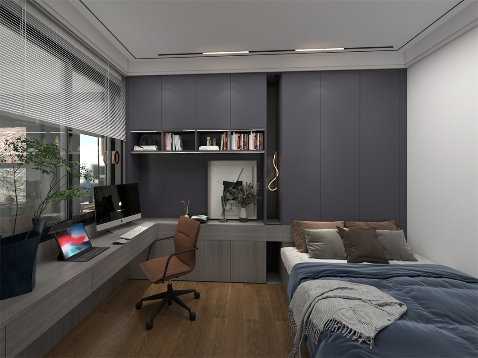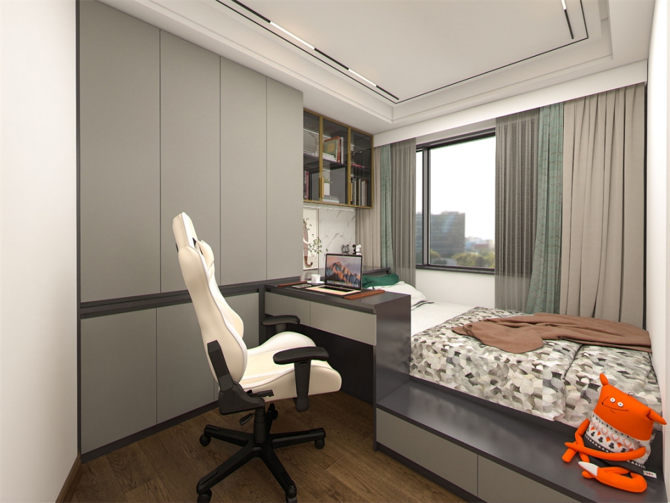 兒子房居室空間較小,設計師經過綜合考慮後,在色彩上選用了不會隨著孩子的長大而過時的鳴柯橡+極光灰雙色設計。定製榻榻米搭配半開放式展示櫃,與書桌進行一體化設計,細致勾勒劃分動靜分區,巧妙發揮空間的最大功能性,陪伴孩子的學習與成長。
