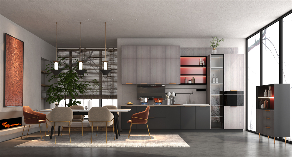 開放式廚區,專屬慕尚皮紋櫃門搭配進口鋼板壓製深淺木紋色黑薔薇櫃板,貫穿起時尚、高級而成熟的強大氣場。在燈光的映襯下,呈現出深淺變幻的顏色效果,為空間注入輕奢氣質。