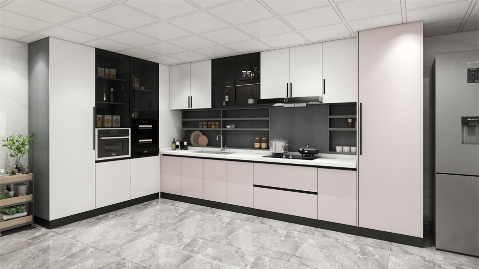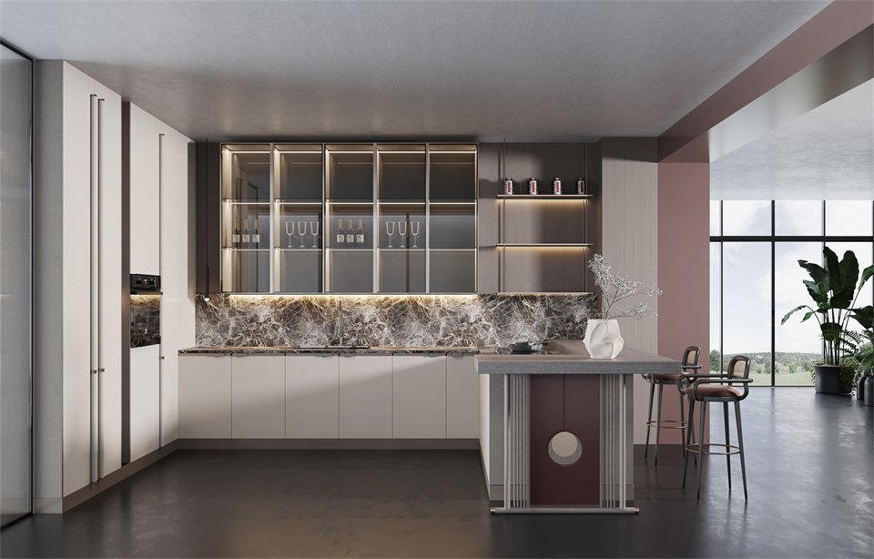 極簡掛牆板係統,層板與黑色鋁框玻璃門設計,減弱空間灰度的衝擊力。高低錯落島台設計,豐富空間層次感,營造溫馨精致的輕奢質感。