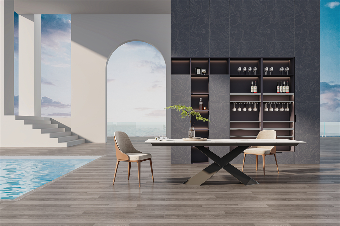 按照藏二露八的定律設計,展示業主的美酒及收藏品,彰顯不入世俗的高貴感!加之摩登秀麗的亮光門板的點綴,為空間注入輕奢氣質,讓用餐環境瞬間變得高雅!