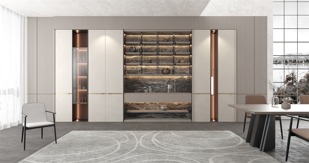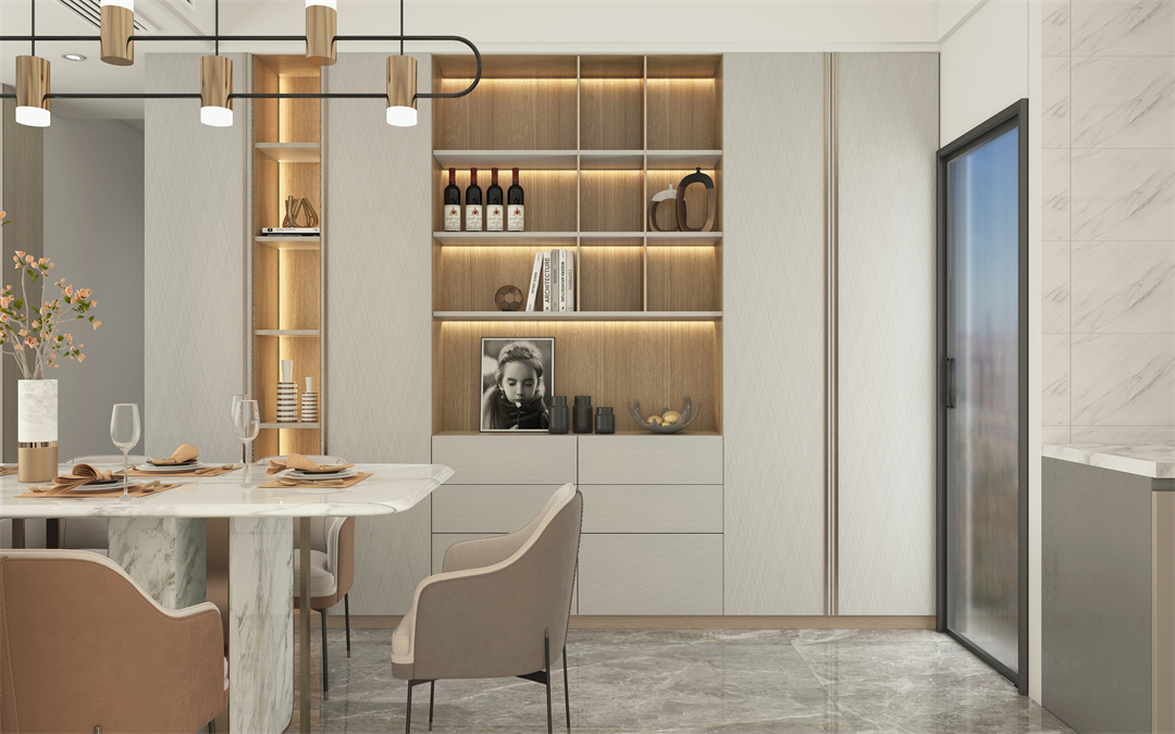通透的玻璃櫃門圍合一麵及頂的餐邊酒櫃,營造出輕簡明朗的空間視覺。有序排布的超白玻璃帶燈層板,在收藏展示各類美酒、珍品的同時又可以防塵,帶來實用性和美觀性的雙重效果。