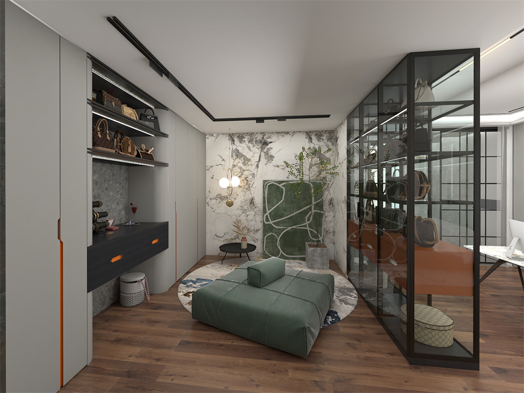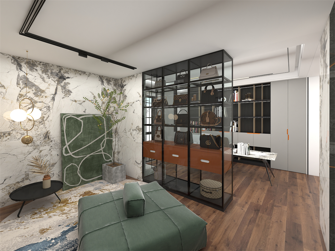 衣帽間與書房之間設置一個鋁合金隔斷櫃,封閉和開放式櫃體結合,在簡潔、秩序和質感中,讓每件物品都能找到最恰當的歸宿。