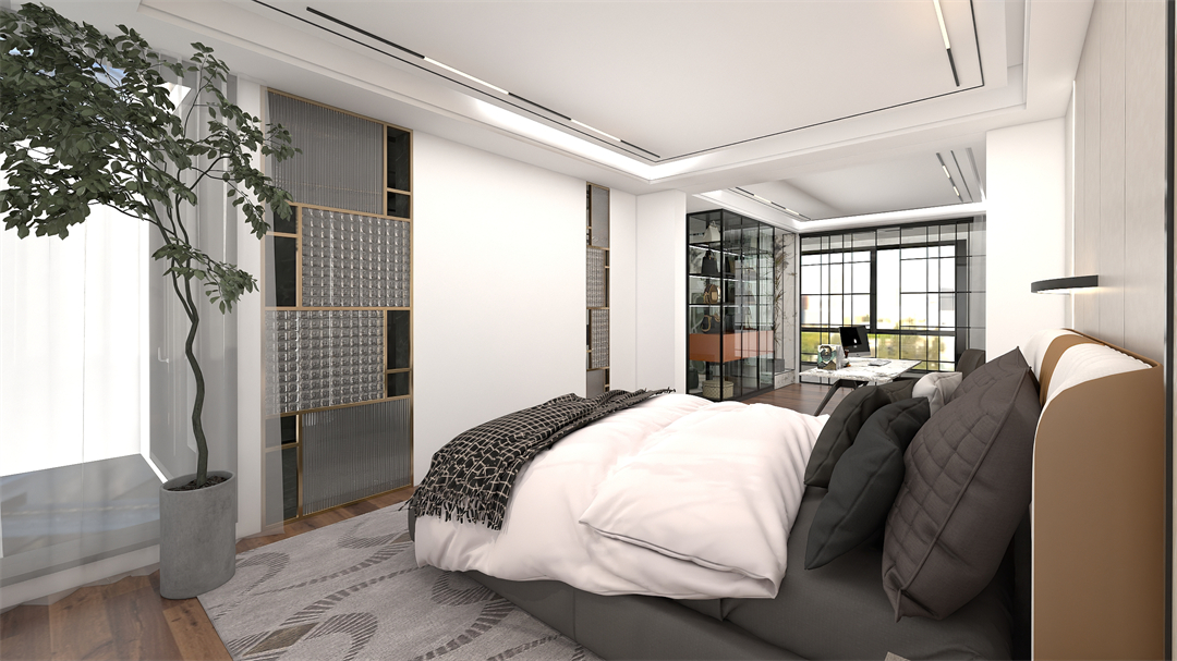 超大的臥室空間,在設計師的規劃下,將多個功能分割巧妙結合,衣帽間、辦公&閱讀區和休憩區互通有序,滿足業主對各個功能的需求。