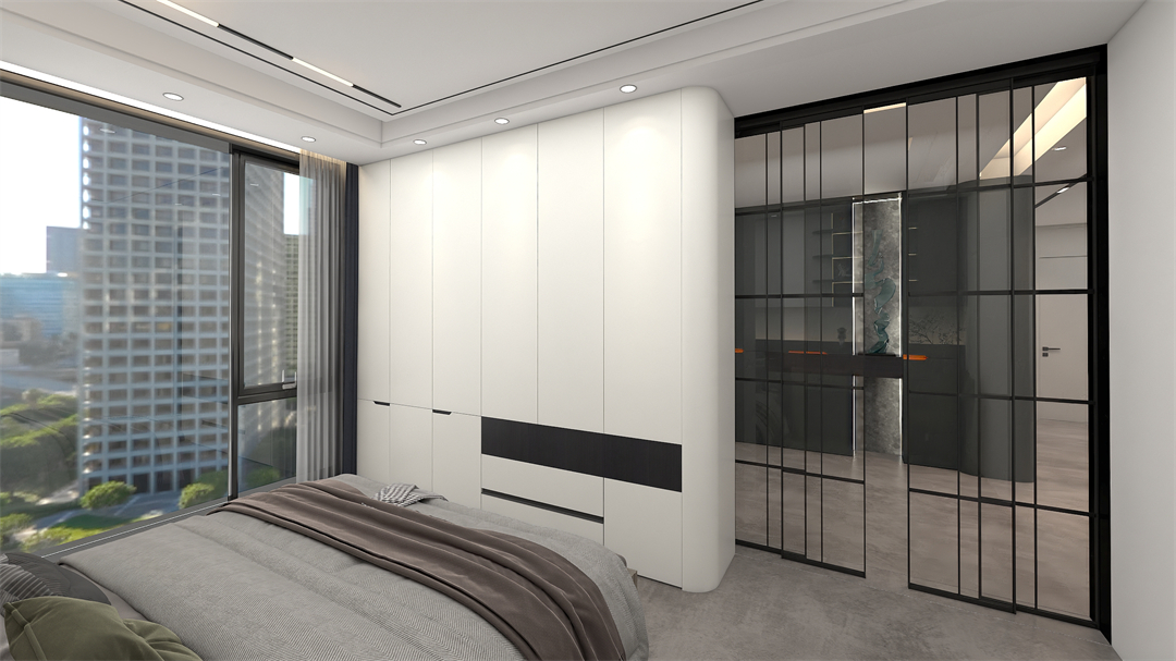 客臥保持整體素雅簡約的調性,進門打造一字型到頂衣櫃,不僅緩解了空間的壓抑感,又增加了收納的便捷性與多樣性。