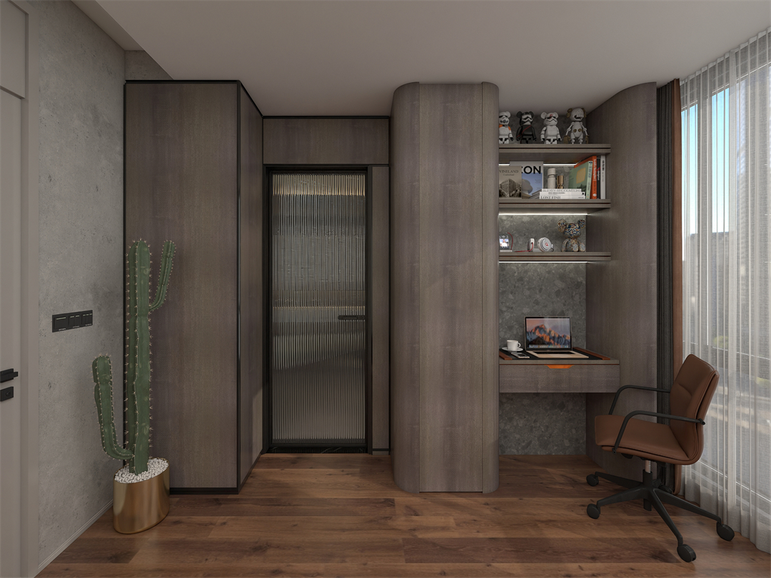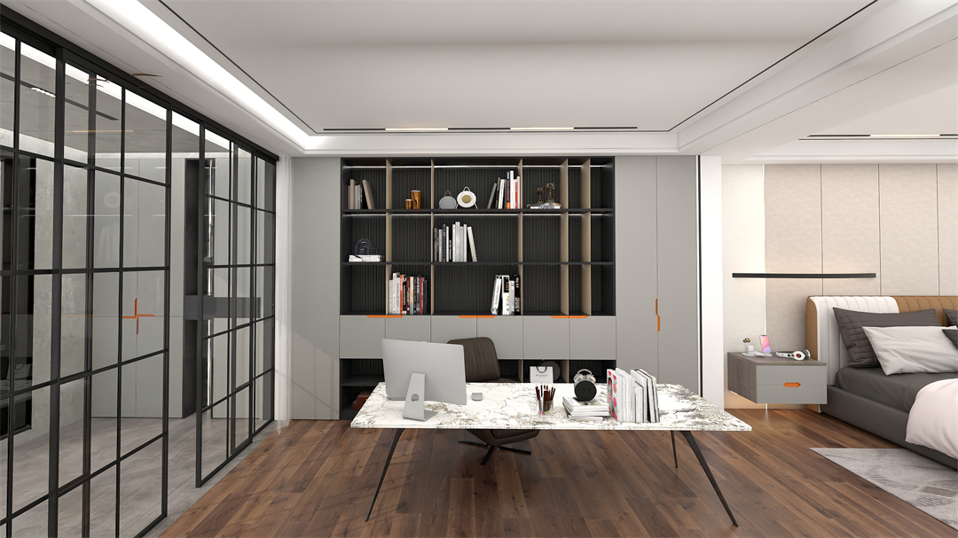 與臥室一體的書房一改嚴肅風,強調功能區域之間的互動交流性!通頂書櫃結合展示櫃設計,既有收納力,又增加了藝術美感。臨睡時分從書櫃拿起一本書,在翻動書頁間不覺心曠神怡,盡收天地之奢。