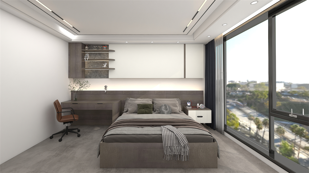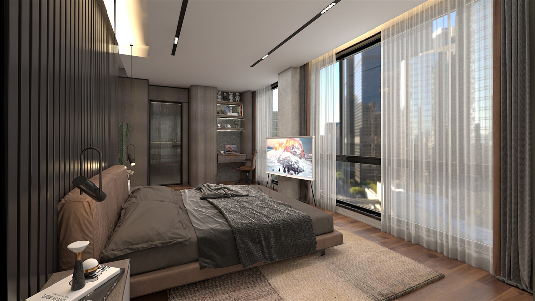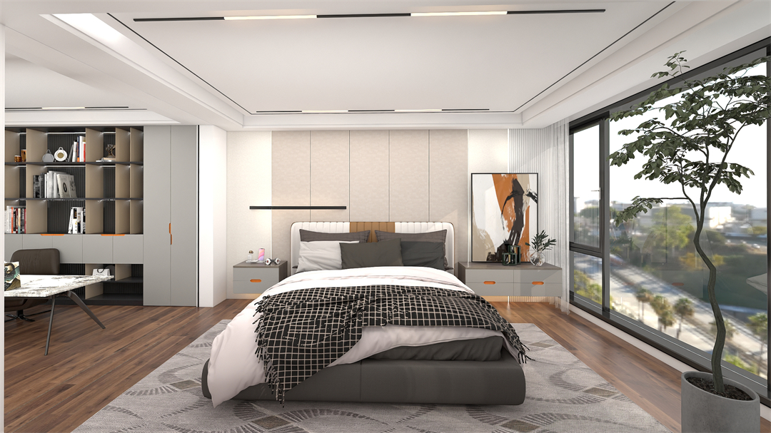 休憩區以低飽和大地色係為主調,輔以少量的亮色,獨特的色彩混搭讓空間怡人而溫暖,創造出舒適靜雅的主臥空間,帶來溫馨的睡眠氛圍。