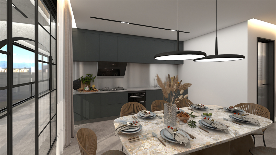 封閉的琬琰青吊櫃與地櫃組合,將廚房的各種電器和雜物收納得整整齊齊,更添舒適有序的感覺。餐廚一體設計使得餐廚區光線、空氣相互流通,提升空間互動性,讓每一次烹飪、就餐變得更加享受愜意。