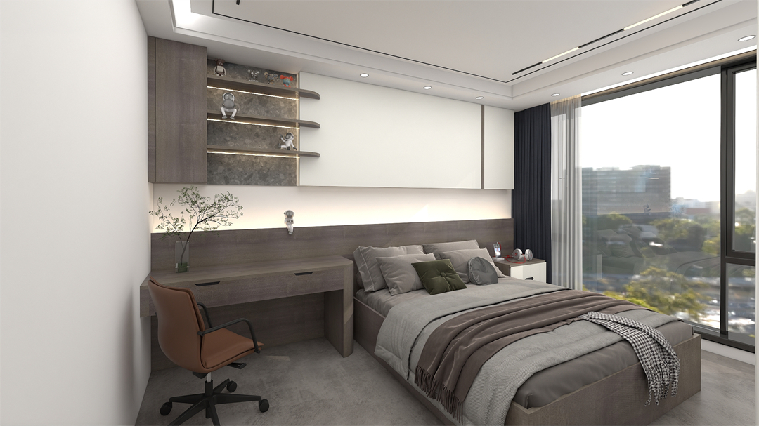 男孩房以睿智靈動的凝脂白高門,搭配設計感十足的半J極光灰PVC一體拉手,輕鬆滿足孩子成長所需的儲存需求!