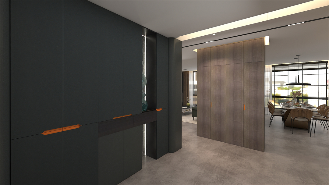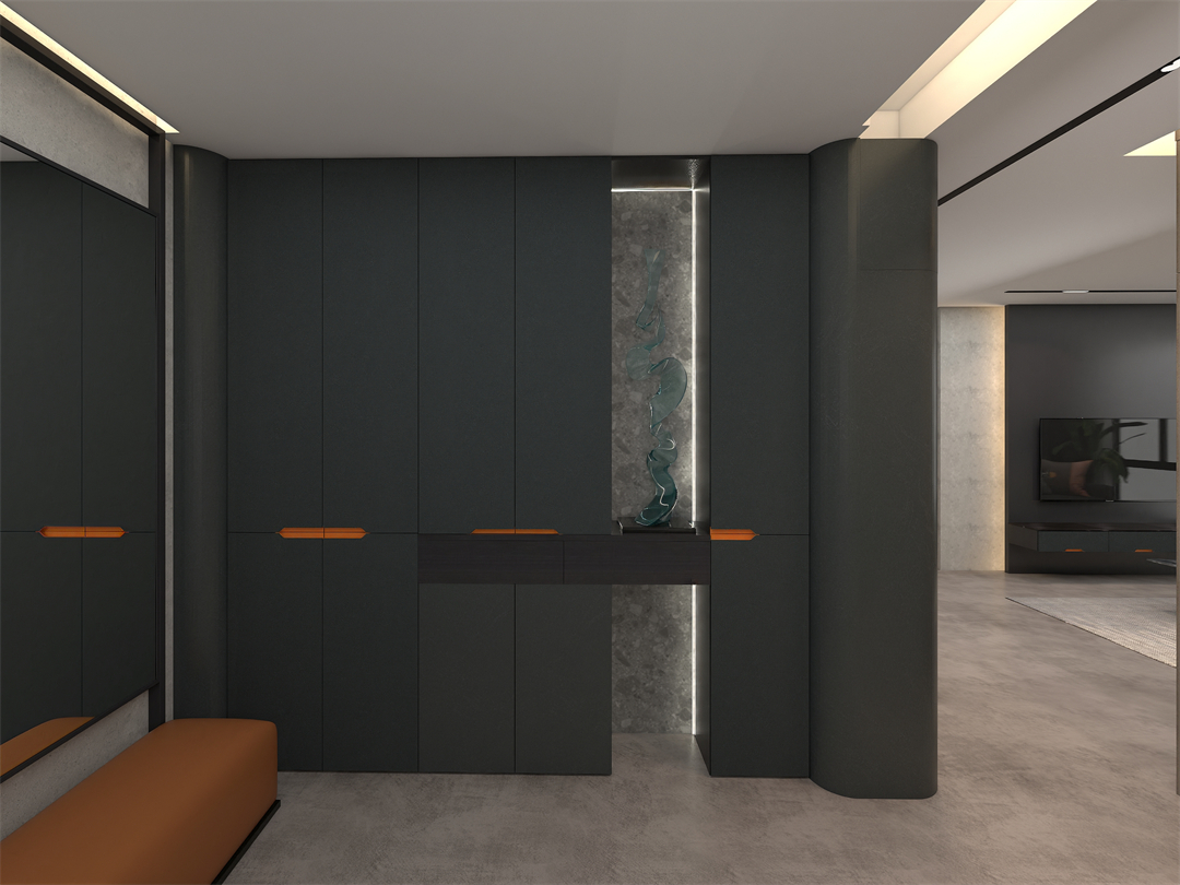 通頂的玄關櫃承托生活憧憬,賦予都市居家應有的精致感!高級琬琰青搭配煙熏橡櫃身,在橙色PVC一體拉手的撞色點綴下,給進出門帶來了優雅、有序的氛圍感!