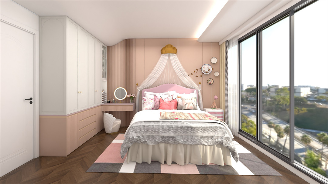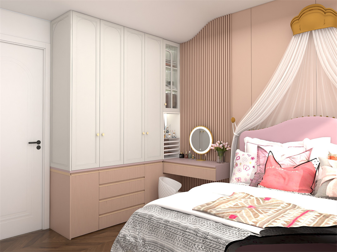 基調更加偏向活潑的女兒房,衣櫃+梳妝台一體式定製櫃,有效利用空間,讓空間更具整體性。