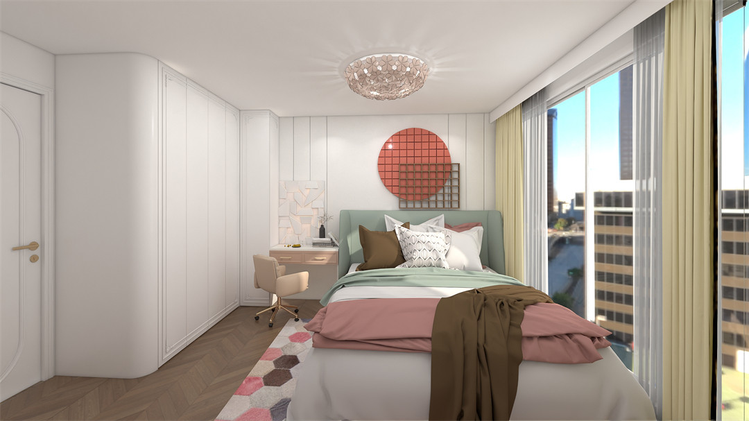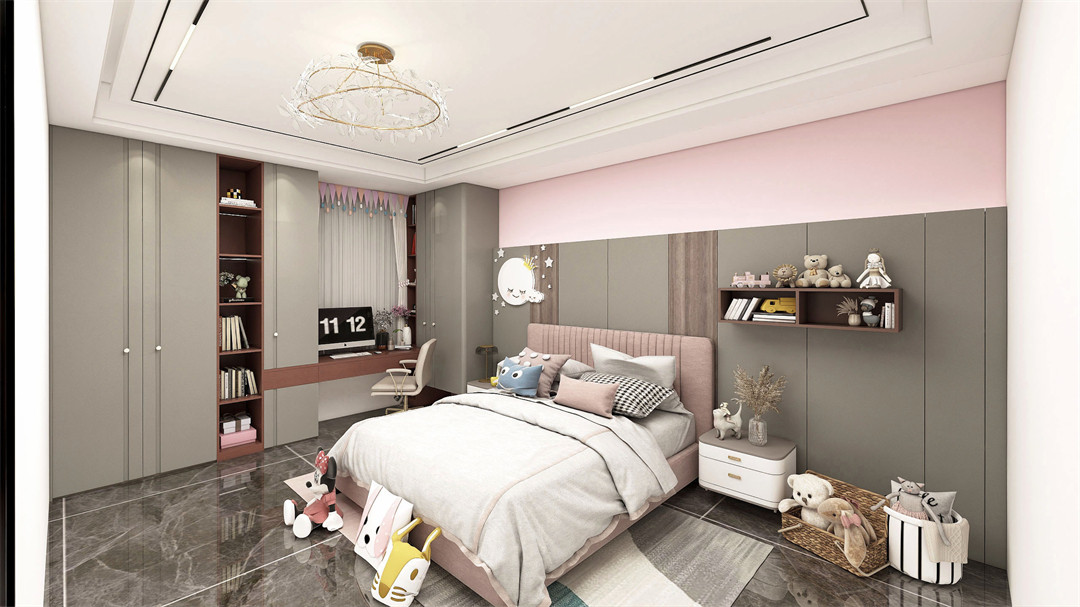 女(nv)孩(hai)房(fang)色(se)調(tiao)采(cai)用(yong)羅(luo)馬(ma)灰(hui)和(he)吉(ji)祥(xiang)紅(hong),掩(yan)映(ying)著(zhe)柔(rou)和(he)的(de)粉(fen)色(se)色(se)調(tiao),貼(tie)心(xin)匹(pi)配(pei)小(xiao)女(nv)孩(hai)活(huo)潑(po)可(ke)愛(ai)的(de)格(ge)調(tiao)喜(xi)好(hao)。書(shu)桌(zhuo)櫃(gui)的(de)量(liang)身(shen)定(ding)製(zhi)設(she)計(ji),功(gong)能(neng)上(shang)滿(man)足(zu)了(le)女(nv)孩(hai)收(shou)納(na)、休息與學習的需求。