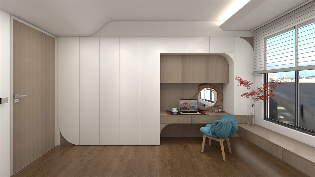 淡淡的白色亮光衣櫃門在空間中肆意蔓延,搭配童趣的圓形切角造型板,為空間增添柔和感和趣味性。衣櫃+書櫃+梳妝台一體化多功能設計,打造超強收納空間的同時,也為孩子成長過程中的活動範圍最大化提供多元相伴。