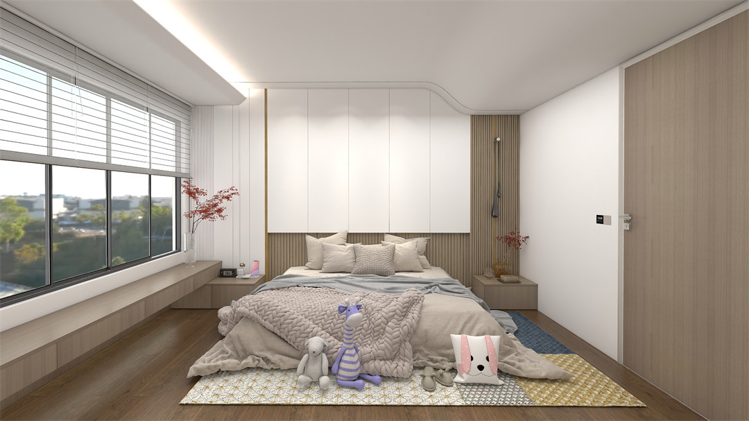 女兒房的設計以白色亮光板為主調,搭配白櫟橡格柵背板,營造出明快、童趣的氛圍感。量身定製的衣櫃、懸空窗邊櫃和搭階床頭櫃,一舉滿足了孩子的衣物、玩具收納和展示需求,目光所及每一寸都能體現父母對女兒濃厚的愛意。
