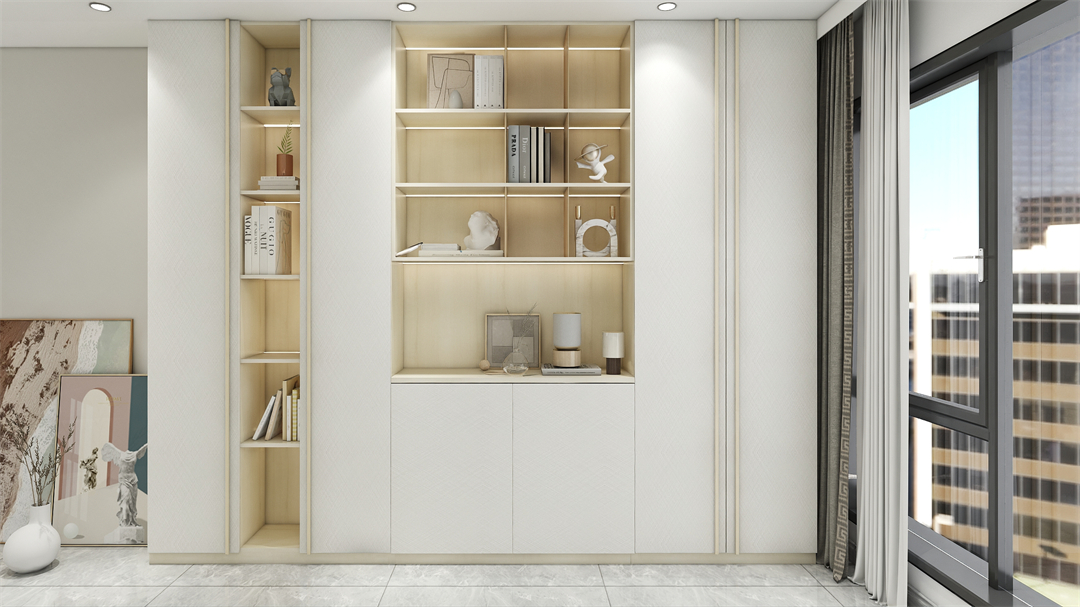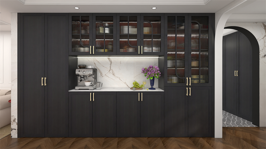 餐邊櫃的基材以奶油白和阿瑪尼白為主,配以精致的金屬拉手,氛圍感直接拉滿。封閉櫃、開放櫃有機組合,櫃子內嵌燈帶設計,搭配法式經典弧型長虹玻璃門,將雅致和浪漫無界銜接,開啟超越“展”與“藏”的生活方式。