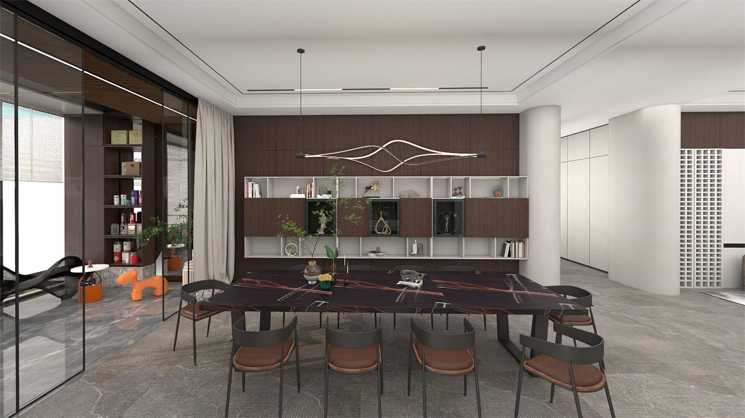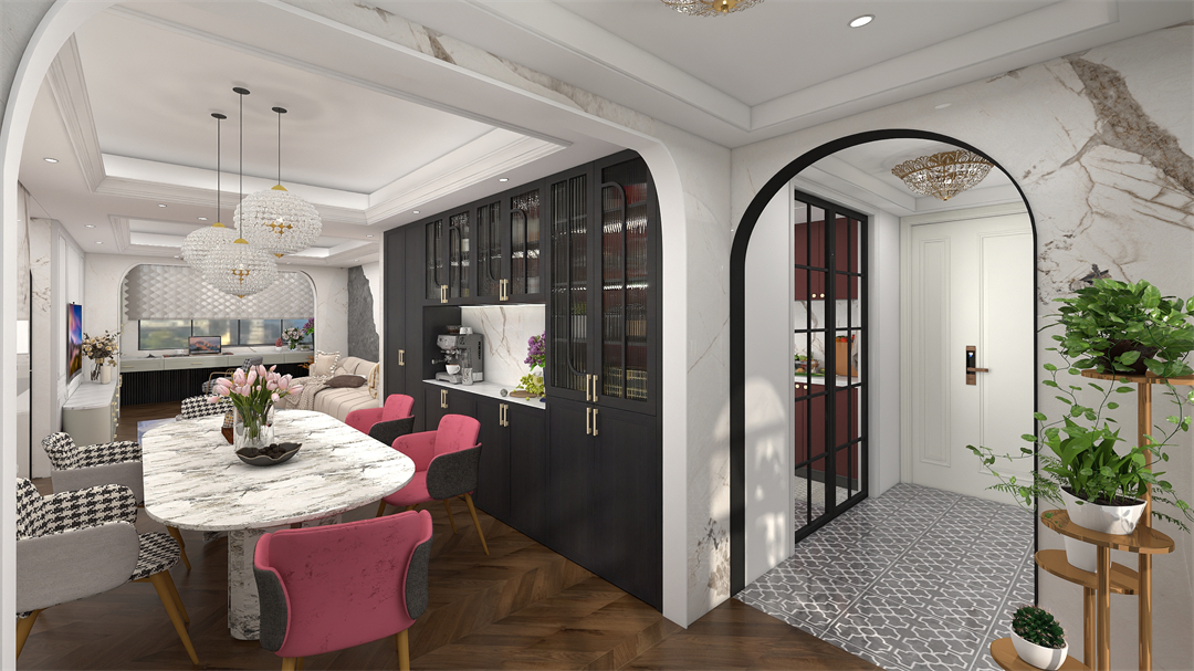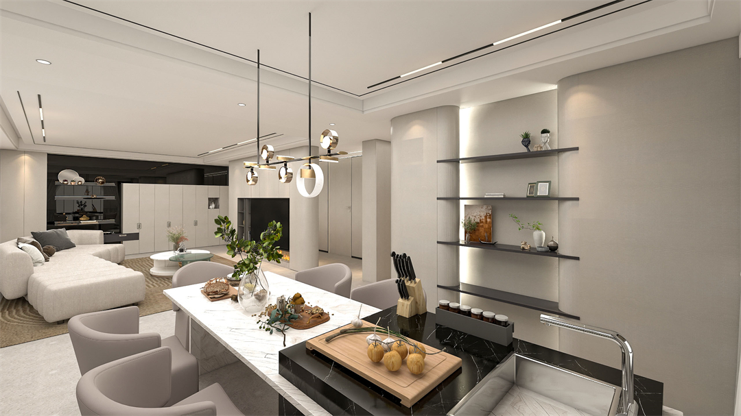 沿yan深shen色se大da理li石shi餐can桌zhuo一yi側ce打da造zao餐can邊bian吊diao櫃gui,有you藏zang有you露lu的de吊diao櫃gui設she計ji與yu溫wen潤run的de刺ci胡hu桃tao牆qiang板ban搭da配pei,在zai滿man足zu收shou納na和he展zhan示shi的de同tong時shi,又you為wei整zheng個ge就jiu餐can空kong間jian增zeng添tian了le一yi份fen奢she雅ya美mei感gan。再zai加jia上shang藝yi術shu吊diao燈deng的de點dian綴zhui,讓rang整zheng個ge用yong餐can區qu域yu多duo了le一yi分fen格ge調tiao感gan及ji煙yan火huo氣qi息xi。