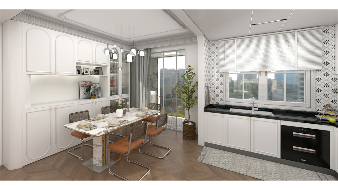 芬蘭木和荔枝白結合,內蘊不張揚,一種隨性的生活態度彰顯無遺。木製層板燈連接視覺與光的脈絡,重燃了“食”光生活的熱情與浪漫。一份恰到好處的幸福感,亦如春風,悄然蔓延!