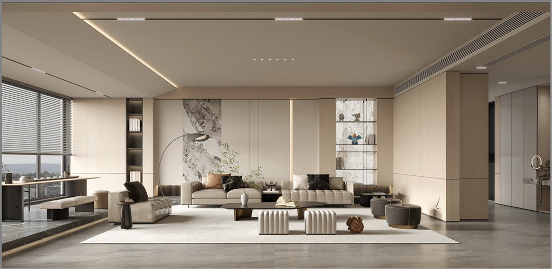 本案的業主是一對事業有成夫婦,男業主是一位愛好收藏的企業家,女業主是某財經媒體的創辦⼈,兩人都偏愛兼具品位與溫情的家居空間。伊百麗設計師拋棄一切冗餘的元素,以舒適靈動的空間設計及極享的人本理念,打造最純粹本真的奢居空間。櫃體采用木紋與門板的立體皮紋進行設計組合,並以極致的工藝與玻璃、皮革、漆麵等材質進行高度的融合,展示奢居空間的極致高雅的同時,透露出材質上的華麗,成就奢而不華、簡而不凡的家居空間。