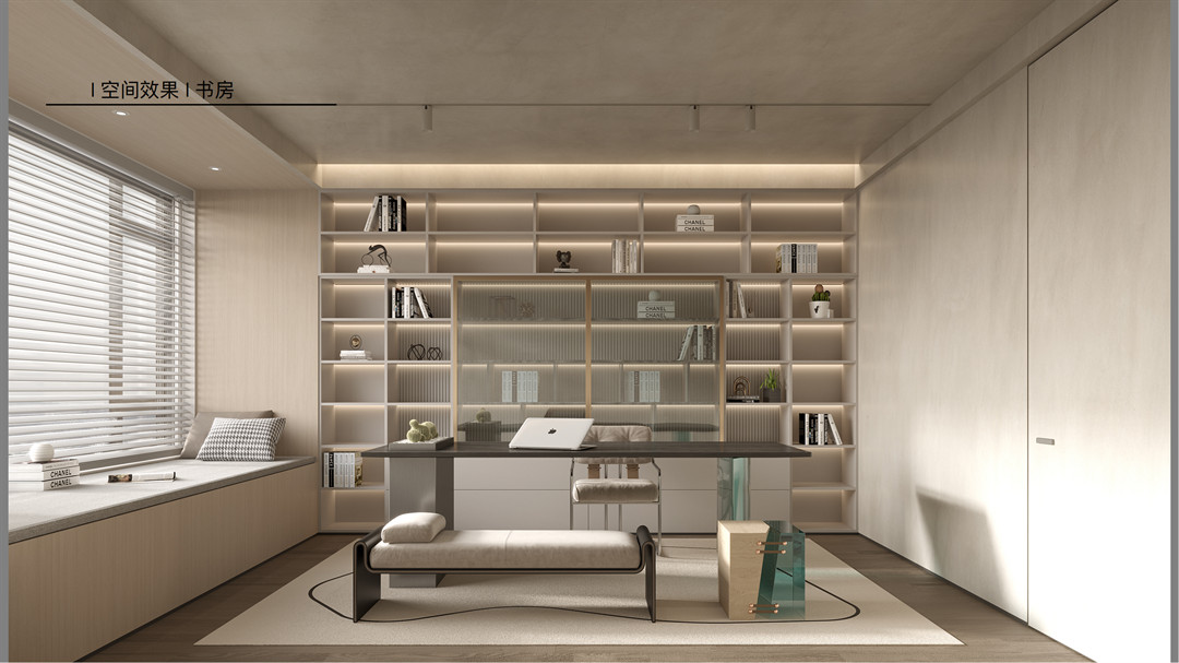 一整麵牆的書櫃+書架,融合了豐富的功能區域。半封閉與半開放的櫃門設計,拋除繁雜、回歸至簡的構設中,運用有序的邏輯安置衝突美學,讓空間變得更加井然有條。一長桌,一飄窗,書中墨香,杯中茶香,動靜皆宜,滋養知識情操。