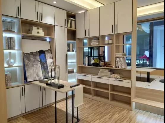 與其他展廳不同,伊百麗展廳以280平方米的超大麵積真實還原了用戶住房的生活場景,陽台、廚房、臥室、客廳、書房、入戶櫃……一應俱全,統一而百搭的裝修風格吸引了無數參展者,展廳人氣居高不下。8平方米的書房將伊麗格空間定製的美學詮釋得淋漓盡致:麵積不大,卻可以分為兩個功能區,靠窗位置是具備升降功能的榻榻米,休息、儲物、會客三不誤,以書架為中介另又隔開一個書房,絲毫沒有擁擠感。